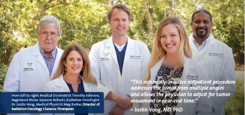 Radiation oncologist Justin Voog, MD, PhD and our highly-trained radiation therapy team now offer an advance treatment for prostate cancer called  stereotactic body radiation therapy (SBRT). The innovative technique use Ridley-Tree’s world-class linear accelerators to safely and effectively deliver powerful doses of radiation to the exact location of the tumor, targeting cancer cells while minimizing effects on surrounding tissues. “This minimally-invasiveoutpatient procedure addresses the tumor from multiple angles and allows the physician to adjust for tumor movementin near-real time,” explains Dr. Voog. The 30-minute procedure only requires five sessions instead of eight weeks ofconventional radiation therapy, resulting in faster recovery times. All SBRT patients receive Space OAR injectable hydrogel prior to treatment to create space between the rectum and the prostate, preventing some of the negative side effects that could result from the radiation. The team incorporates a CT simulation scan as well as image-guided radiotherapy to achieve a high-level of precision during the treatment. The American Society for Radiation Oncology (ASTRO), the organization that accredited Ridley-Tree’s Radiation Therapy Department, lists SBRT as the standard of care for low- and intermediate-risk prostate cancer